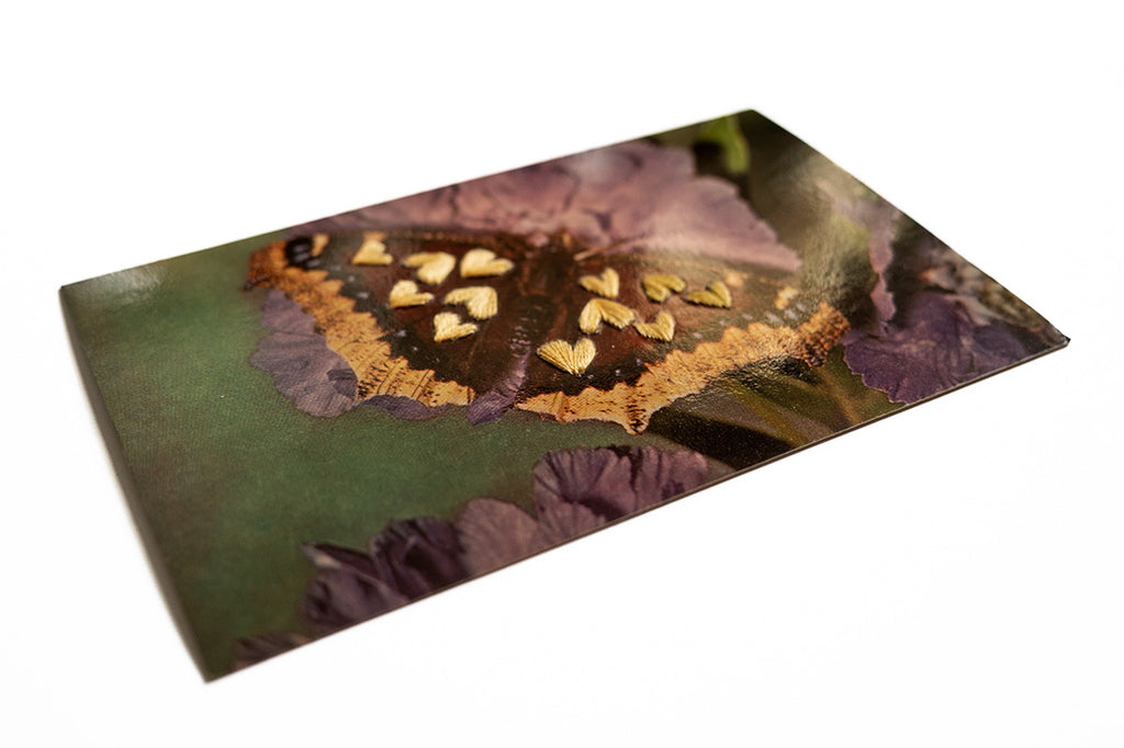 The postcard features a Red-winged Charaxes butterfly. Golden yellow hearts have been embroidered onto the wings in cotton thread.