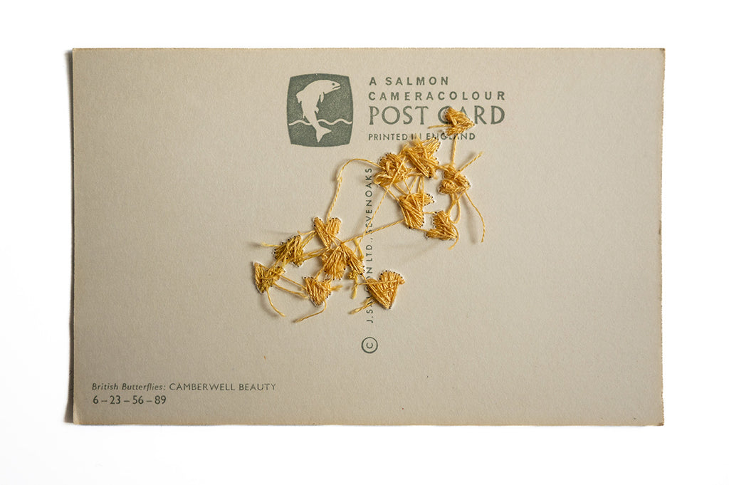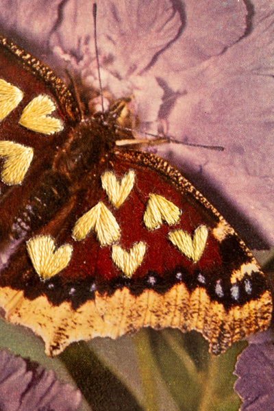 This series features hand-embroidered hearts on vintage butterfly postcards, drawing a quiet parallel between metamorphosis and the evolution of love. Like the butterfly, love grows through change, deepening over time.